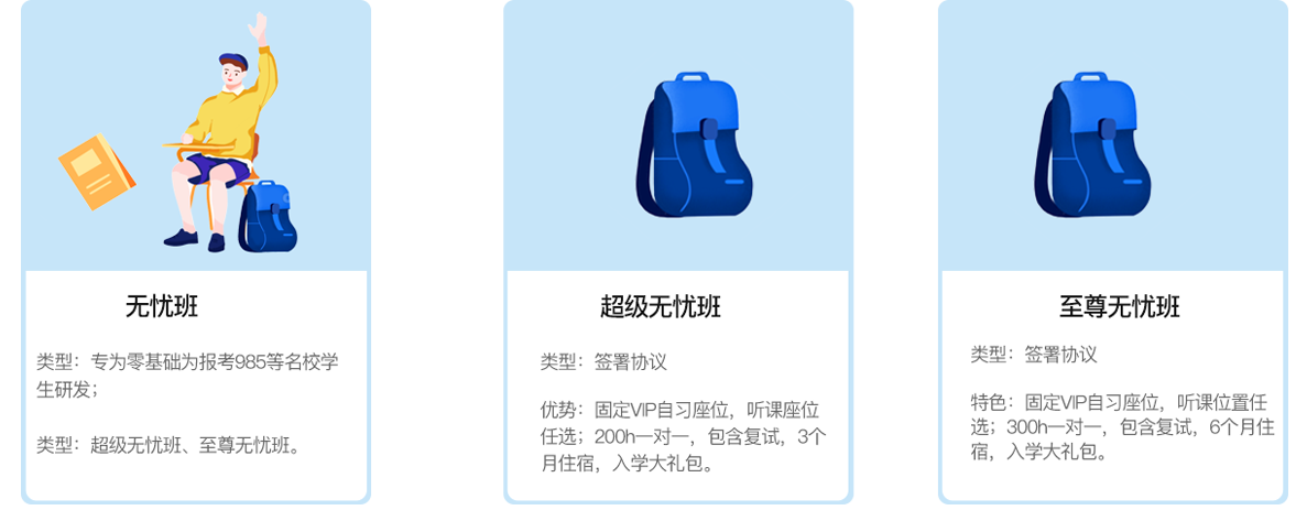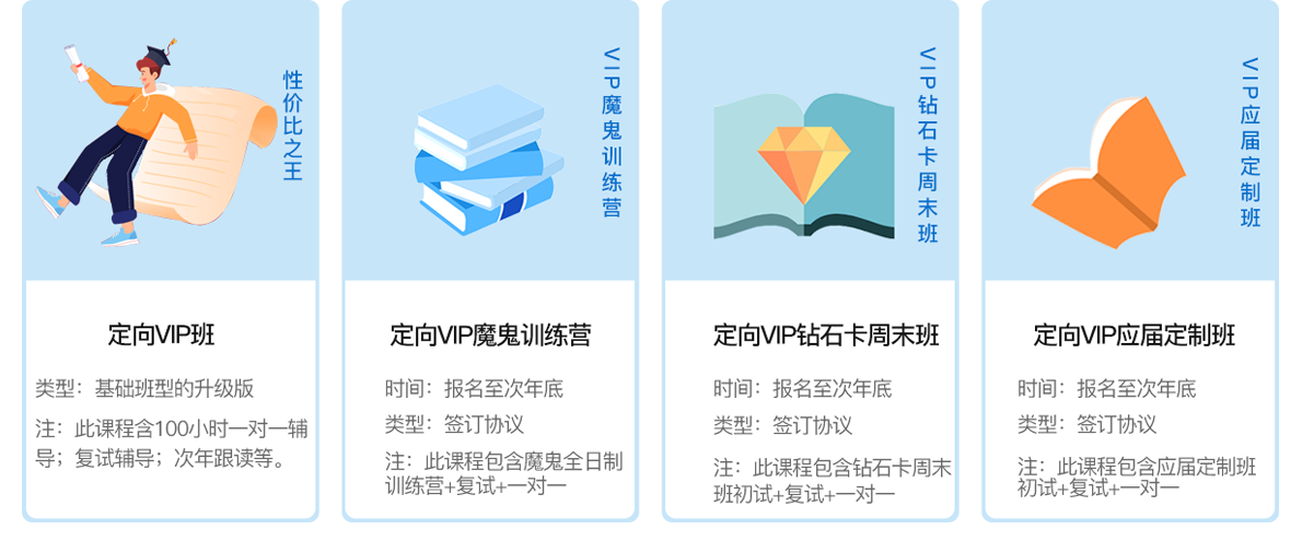特点:针对零基础或报考985名校的同学;全科不限时一对一和任何班型跟班;24小时保姆式学习,定向精细化辅导;赠送全套教材+真题资料;拎包入学。